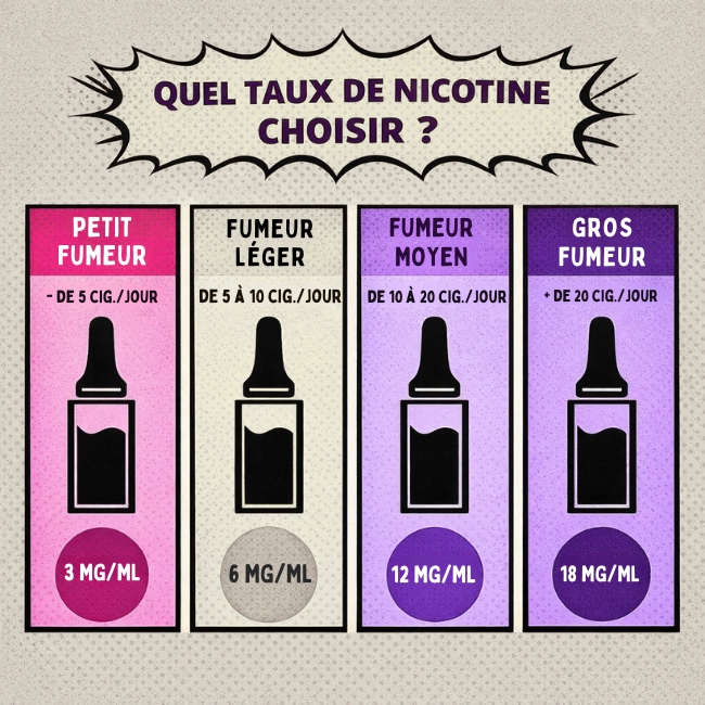 Le taux de nicotine doit toujours être choisi en fonction de votre consommation passée et de votre matériel.