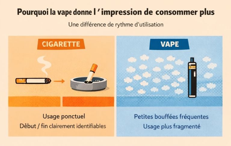 Pour une analyse plus détaillée de ce phénomène, notamment sur les différences d’absorption et les habitudes de consommation, ce sujet est développé dans l’article « Je vapote plus que je ne fumais : addiction, absorption et comment y voir clair ».