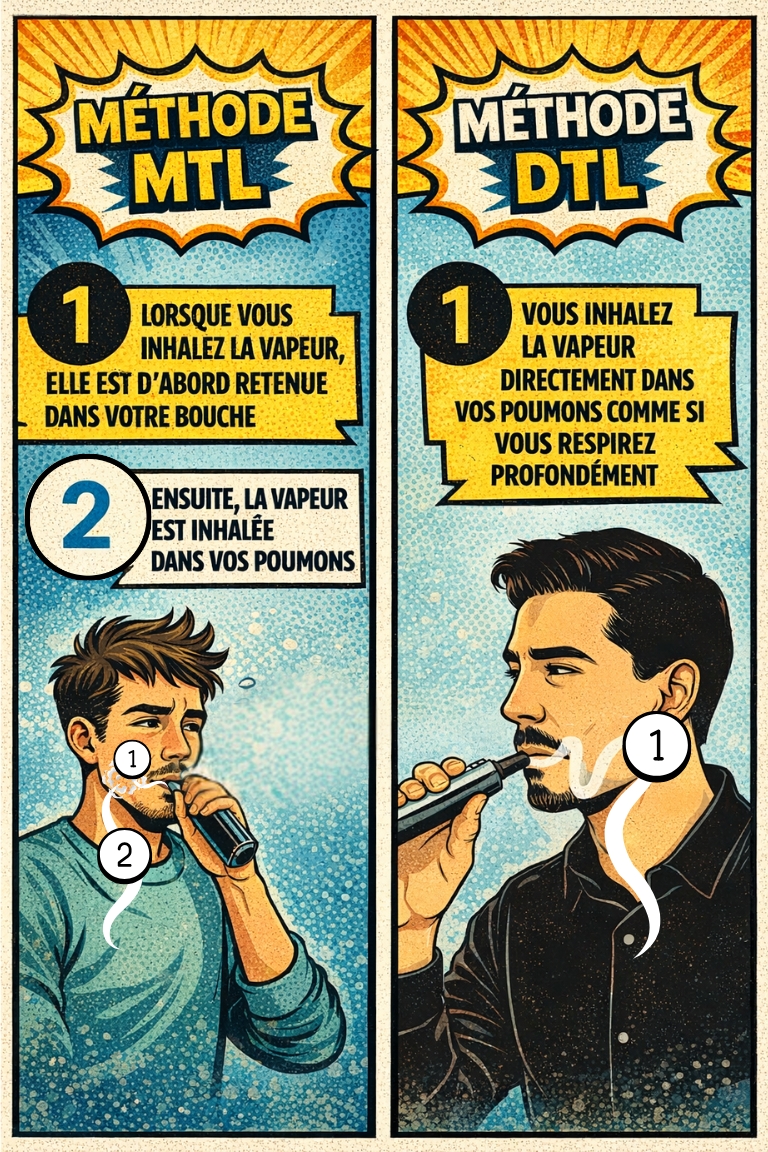 La technique d’inhalation joue également un rôle important. Certaines cigarettes électroniques sont conçues pour un tirage indirect (MTL), proche de celui d’une cigarette classique, tandis que d’autres utilisent une inhalation directe (DTL). Pour comprendre ces différences, vous pouvez consulter l’article.